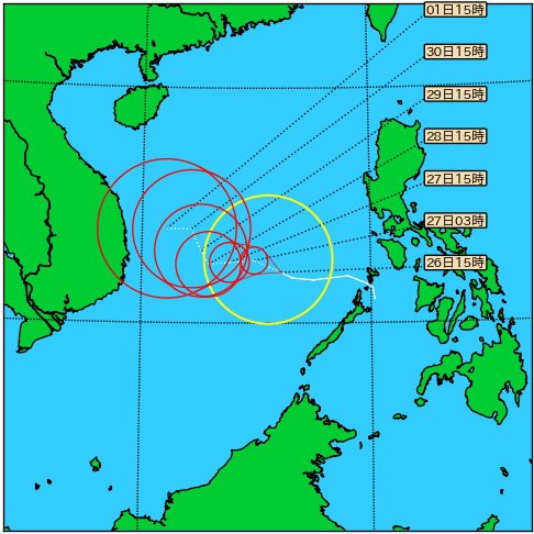 台風情報・進路予想は台風の1日(24時間)先までの12時間刻みの予報を3時間ごとに発表し、さらに5日(120時間)先までの24時間刻みの予報を6時間ごとに発表します。予報の内容は、各予報時刻の台風の中心位置(予報円の中心と半径)、進行方向と速度、中心気圧、最大風速、最大瞬間風速、暴風警戒域です。