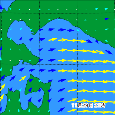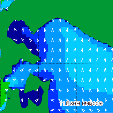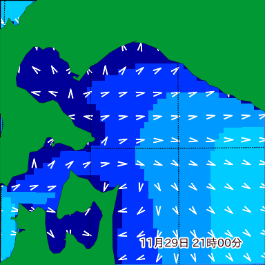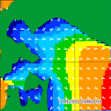 マ述付近の波高を2日先まで分布図で確認できます。波高予測を広域で確認できるので、台風や低気圧による波高の推移や沖合のポイントの波高の参考になります。