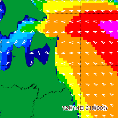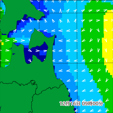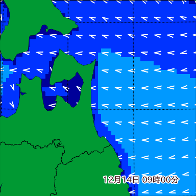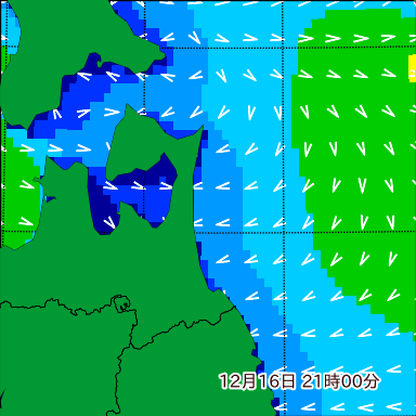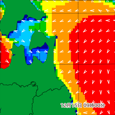 ツ森Ep付近の波高を2日先まで分布図で確認できます。波高予測を広域で確認できるので、台風や低気圧による波高の推移や沖合のポイントの波高の参考になります。