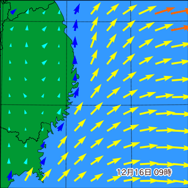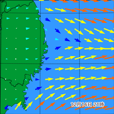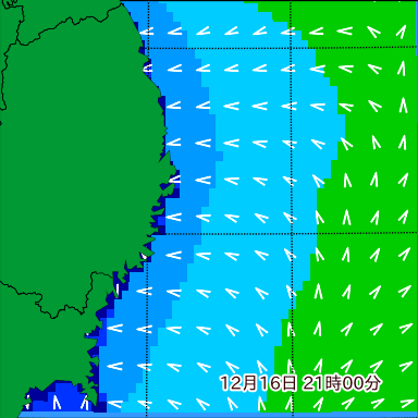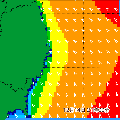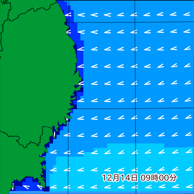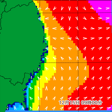 E{付近の波高を2日先まで分布図で確認できます。波高予測を広域で確認できるので、台風や低気圧による波高の推移や沖合のポイントの波高の参考になります。