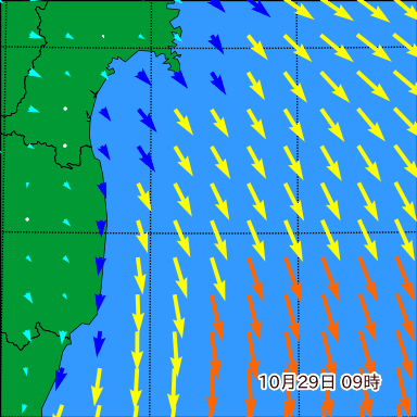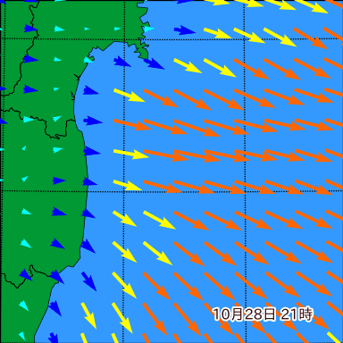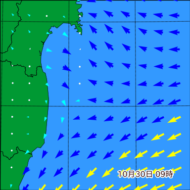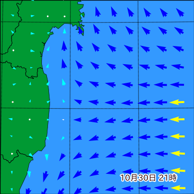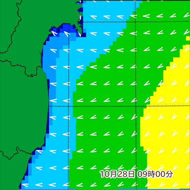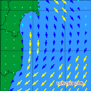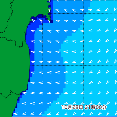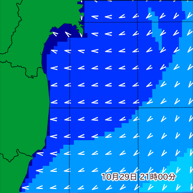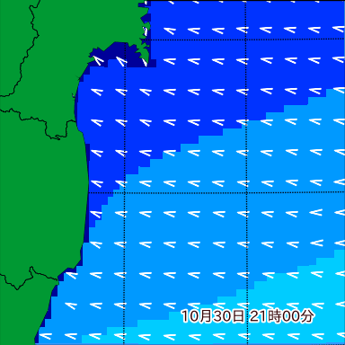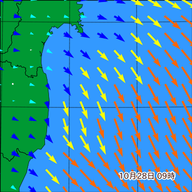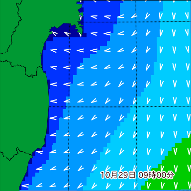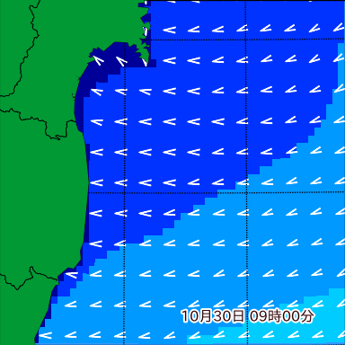 ``ヨ付近の波高を2日先まで分布図で確認できます。波高予測を広域で確認できるので、台風や低気圧による波高の推移や沖合のポイントの波高の参考になります。