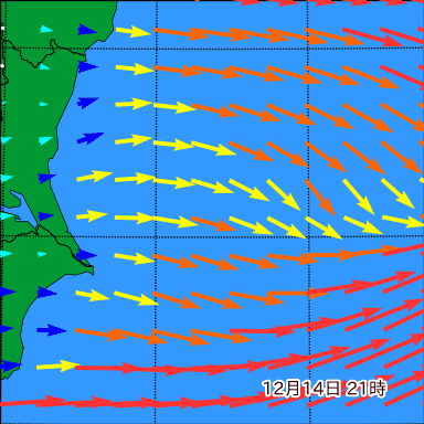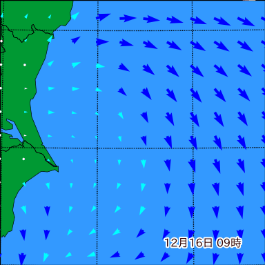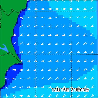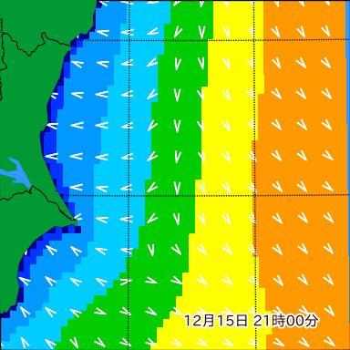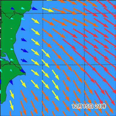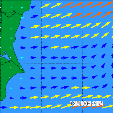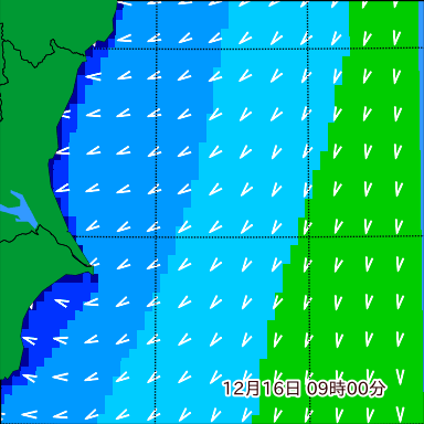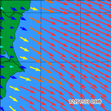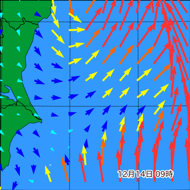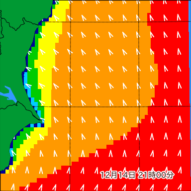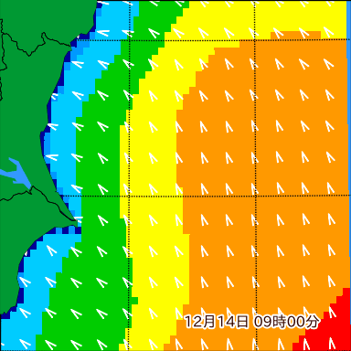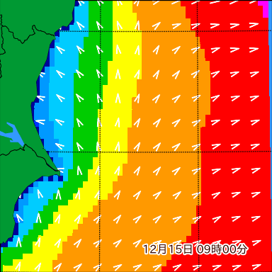 付近の波高を2日先まで分布図で確認できます。波高予測を広域で確認できるので、台風や低気圧による波高の推移や沖合のポイントの波高の参考になります。