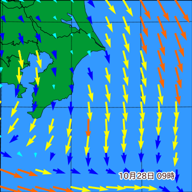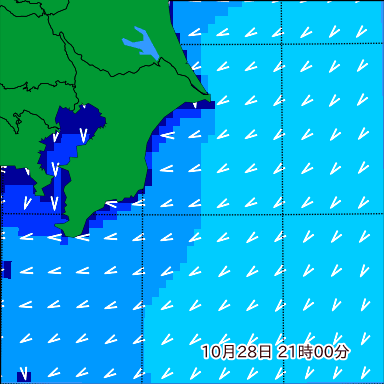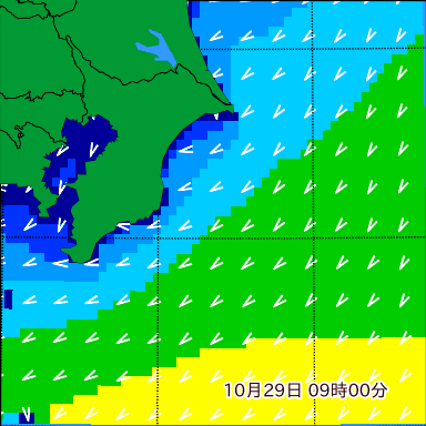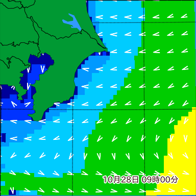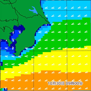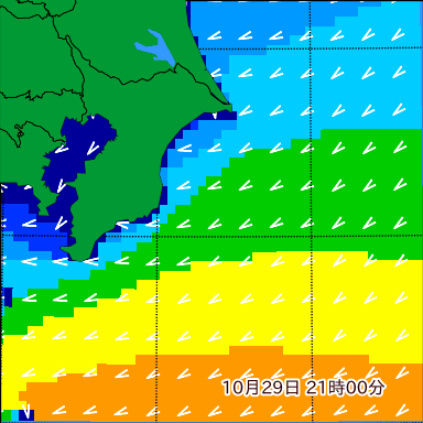 [付近の波高を2日先まで分布図で確認できます。波高予測を広域で確認できるので、台風や低気圧による波高の推移や沖合のポイントの波高の参考になります。