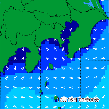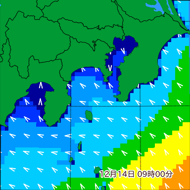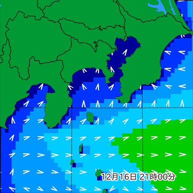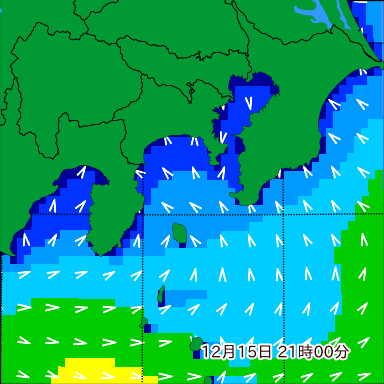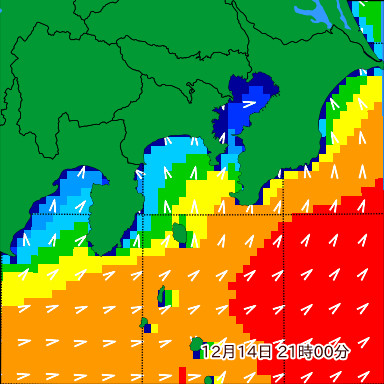 湘南付近の波高を2日先まで分布図で確認できます。波高予測を広域で確認できるので、台風や低気圧による波高の推移や沖合のポイントの波高の参考になります。