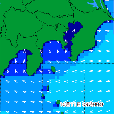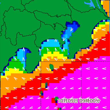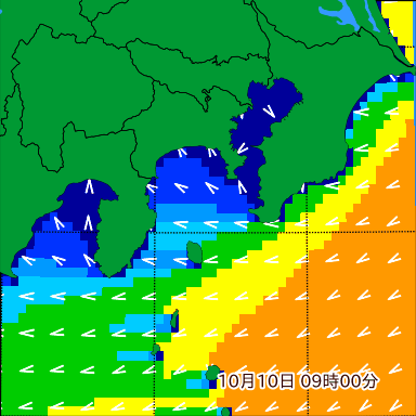 テ付近の波高を2日先まで分布図で確認できます。波高予測を広域で確認できるので、台風や低気圧による波高の推移や沖合のポイントの波高の参考になります。