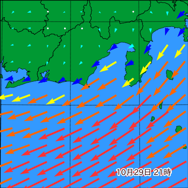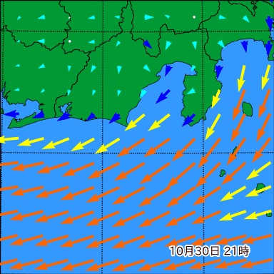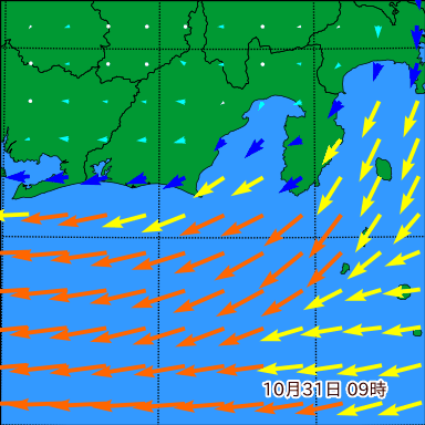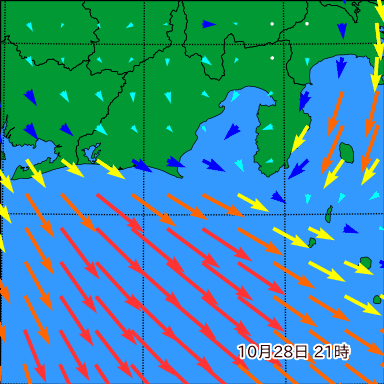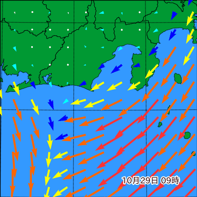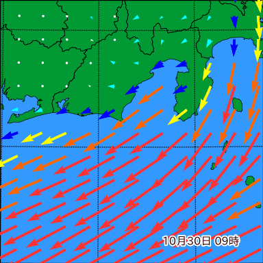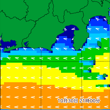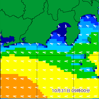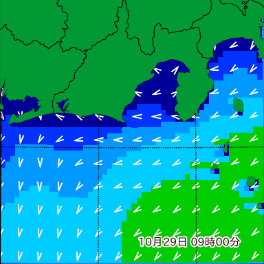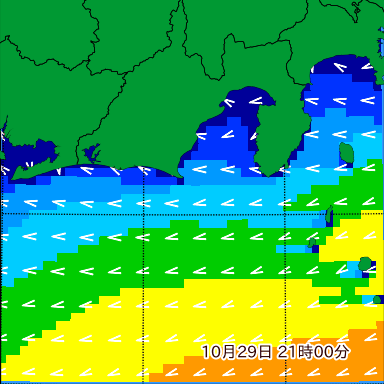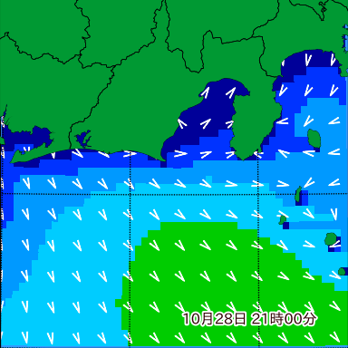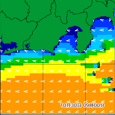 ノ伝付近の波高を2日先まで分布図で確認できます。波高予測を広域で確認できるので、台風や低気圧による波高の推移や沖合のポイントの波高の参考になります。