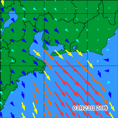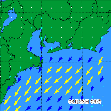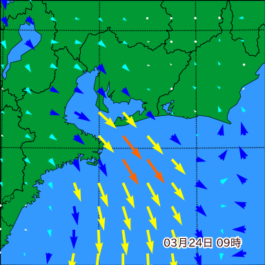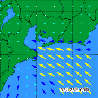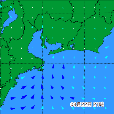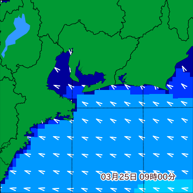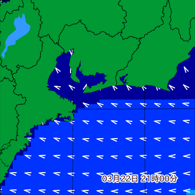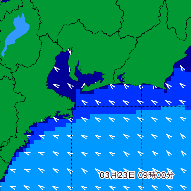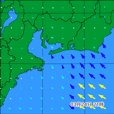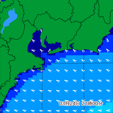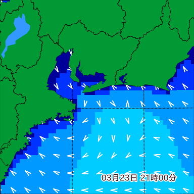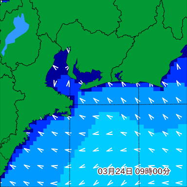 伊勢湾付近の波高を2日先まで分布図で確認できます。波高予測を広域で確認できるので、台風や低気圧による波高の推移や沖合のポイントの波高の参考になります。