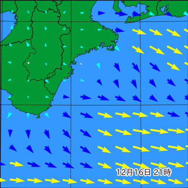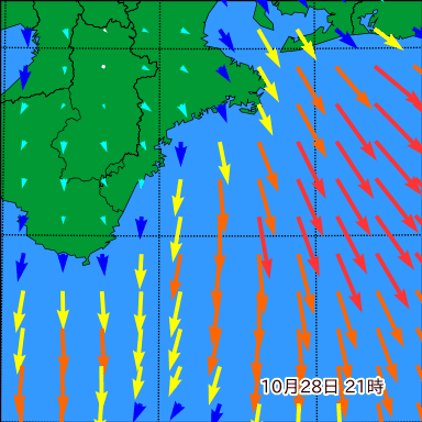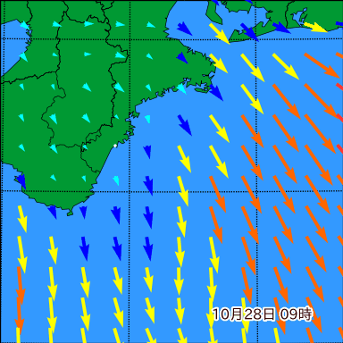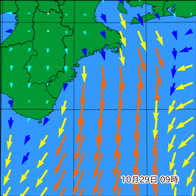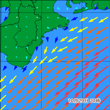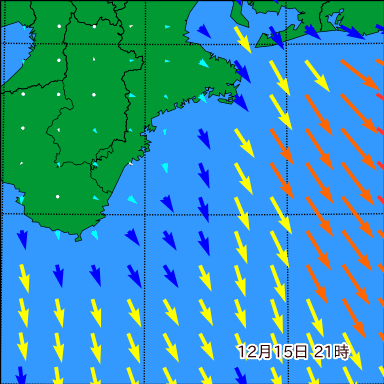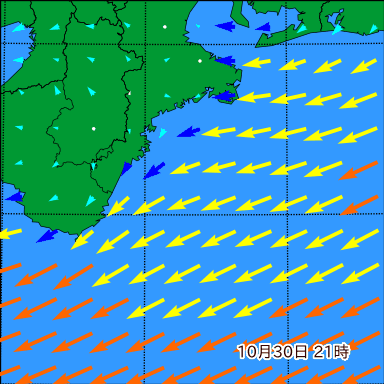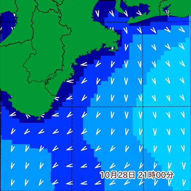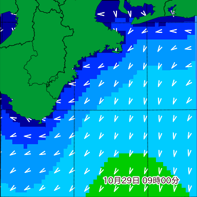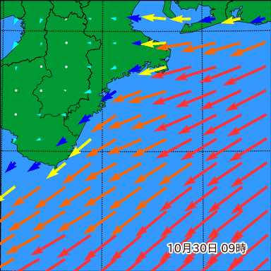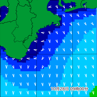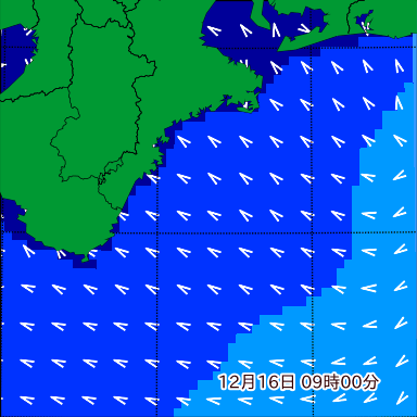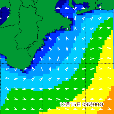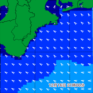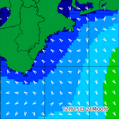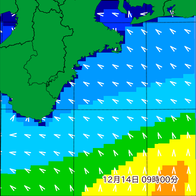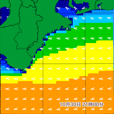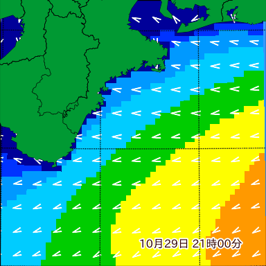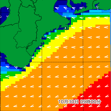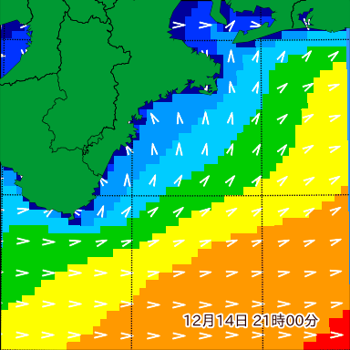 F付近の波高を2日先まで分布図で確認できます。波高予測を広域で確認できるので、台風や低気圧による波高の推移や沖合のポイントの波高の参考になります。