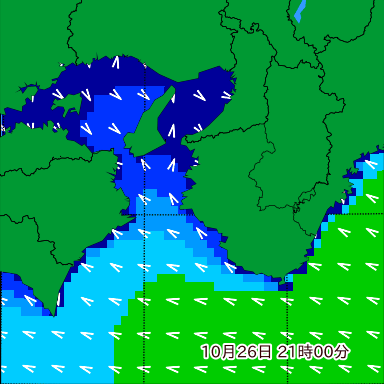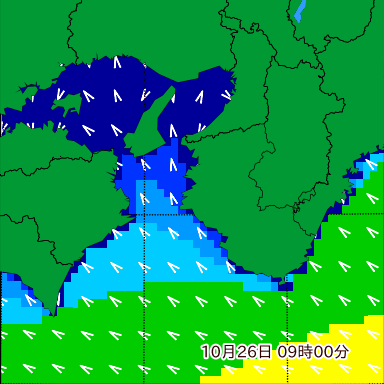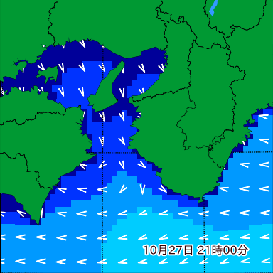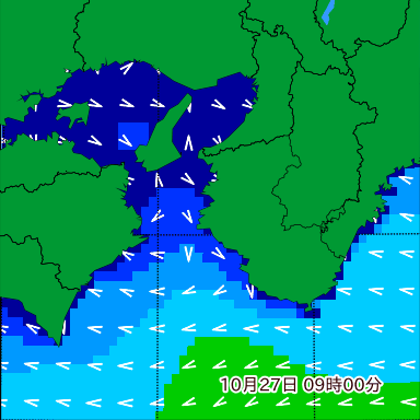 WH付近の波高を2日先まで分布図で確認できます。波高予測を広域で確認できるので、台風や低気圧による波高の推移や沖合のポイントの波高の参考になります。
