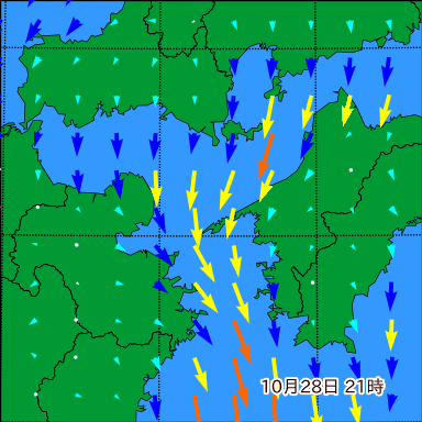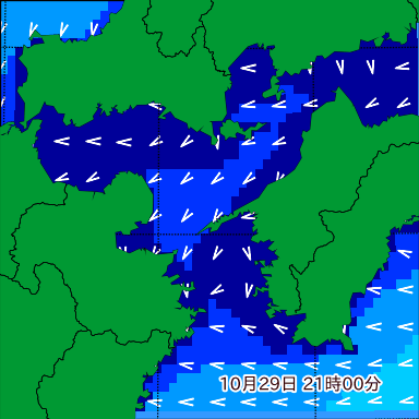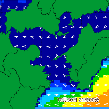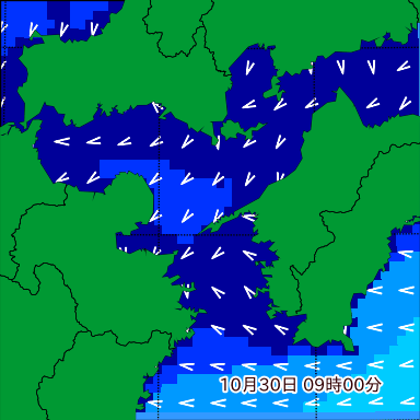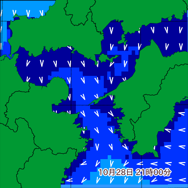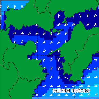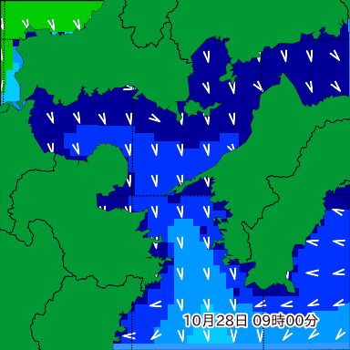 ハ府p付近の波高を2日先まで分布図で確認できます。波高予測を広域で確認できるので、台風や低気圧による波高の推移や沖合のポイントの波高の参考になります。