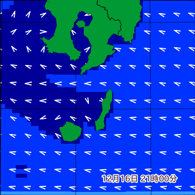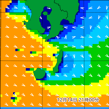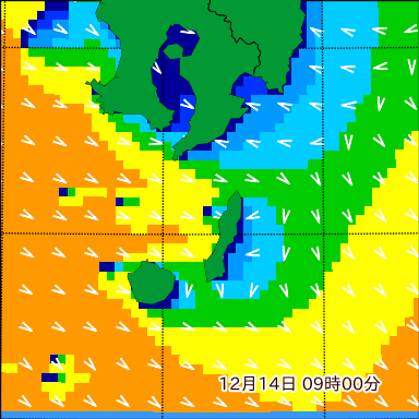 C付近の波高を2日先まで分布図で確認できます。波高予測を広域で確認できるので、台風や低気圧による波高の推移や沖合のポイントの波高の参考になります。