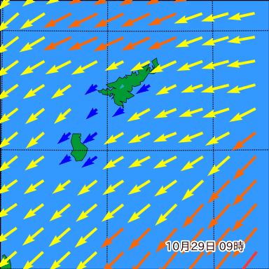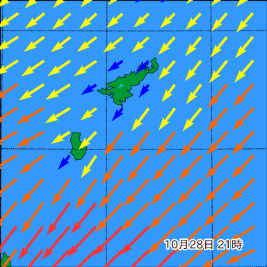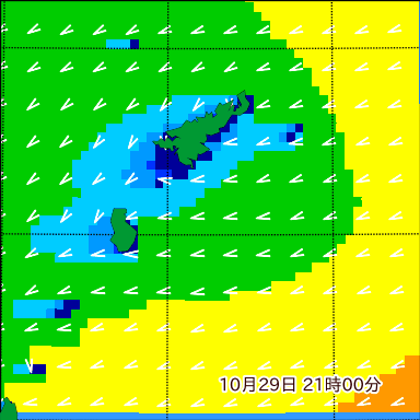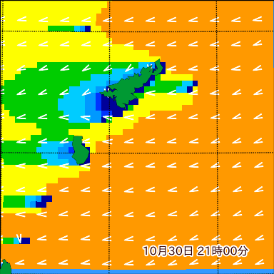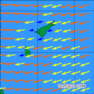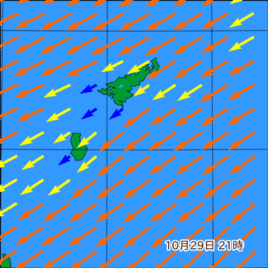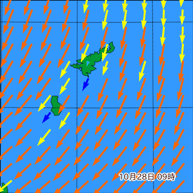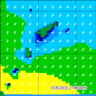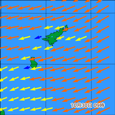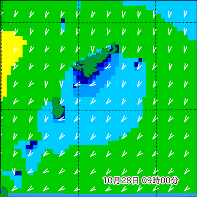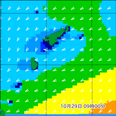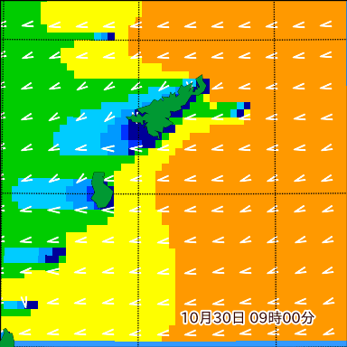蜩付近の波高を2日先まで分布図で確認できます。波高予測を広域で確認できるので、台風や低気圧による波高の推移や沖合のポイントの波高の参考になります。