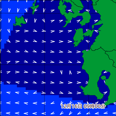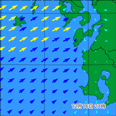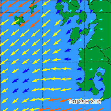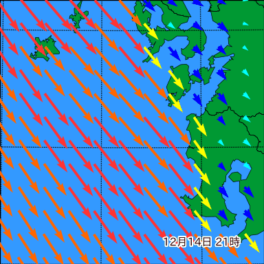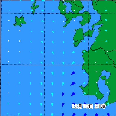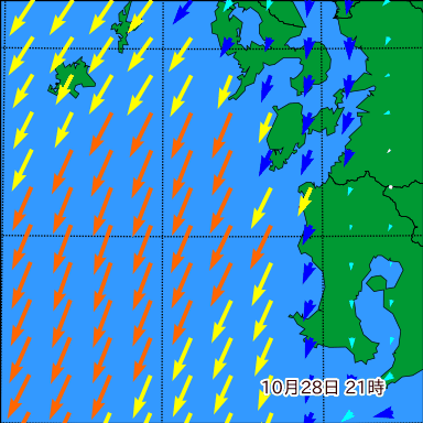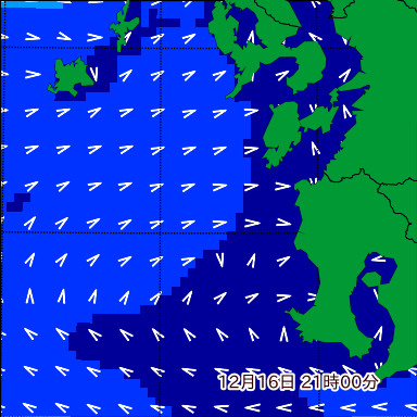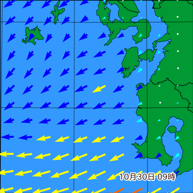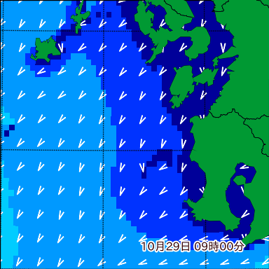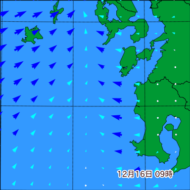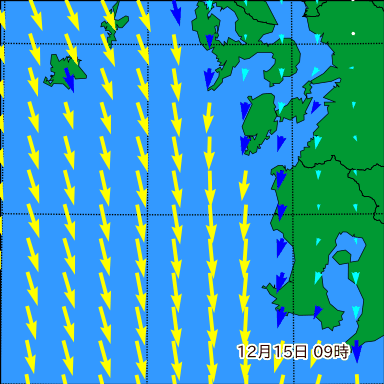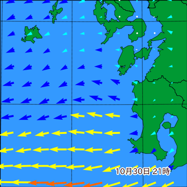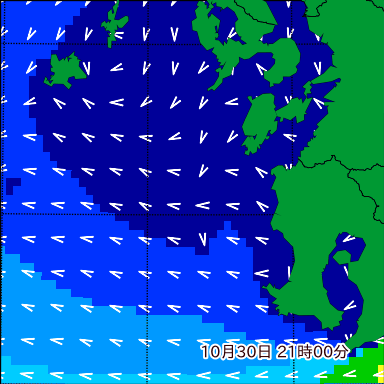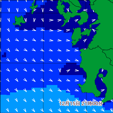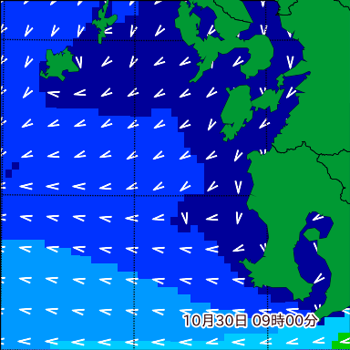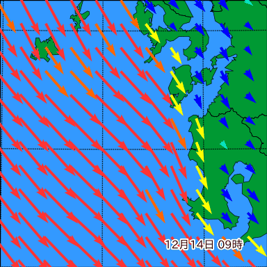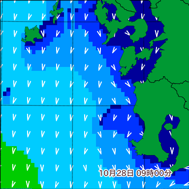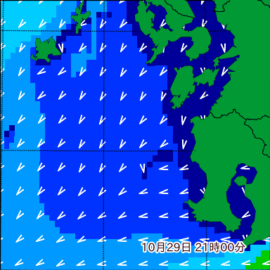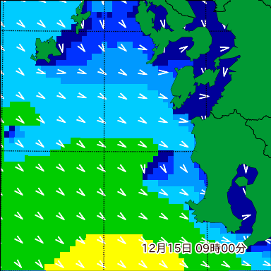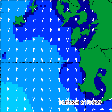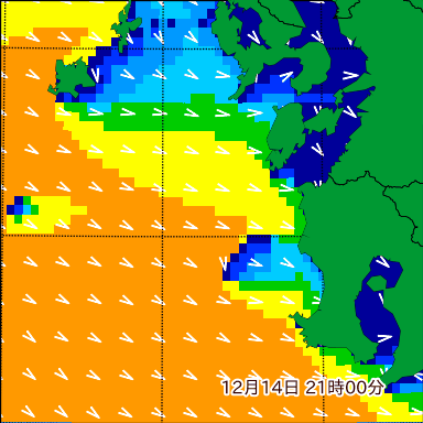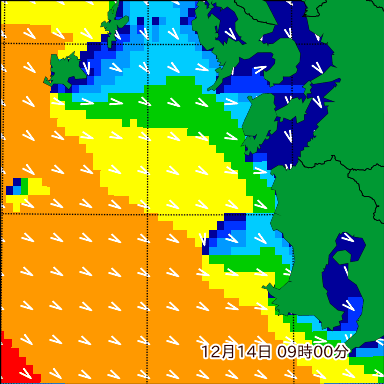 F付近の波高を2日先まで分布図で確認できます。波高予測を広域で確認できるので、台風や低気圧による波高の推移や沖合のポイントの波高の参考になります。