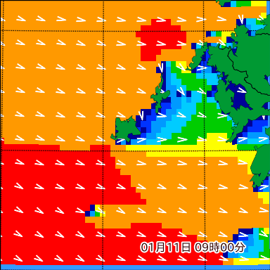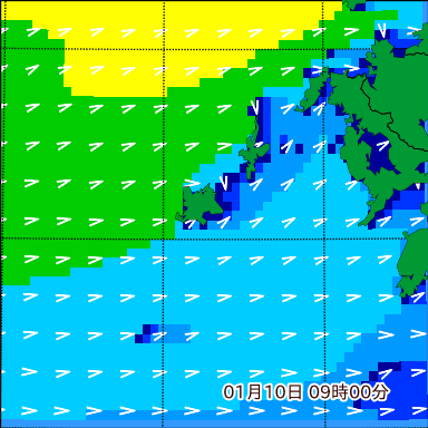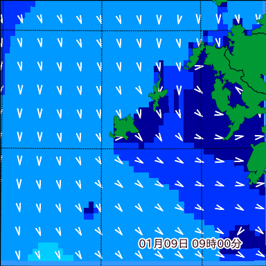 莠泌ウカ轣付近の波高を2日先まで分布図で確認できます。波高予測を広域で確認できるので、台風や低気圧による波高の推移や沖合のポイントの波高の参考になります。