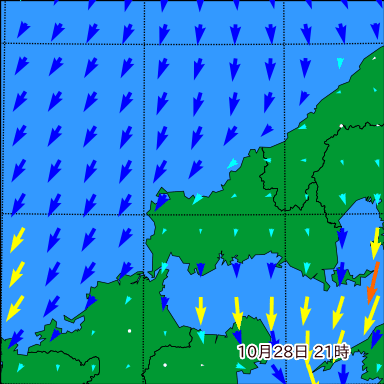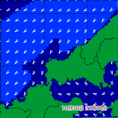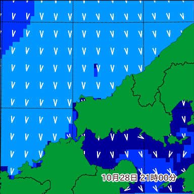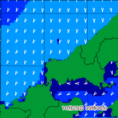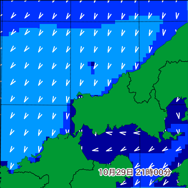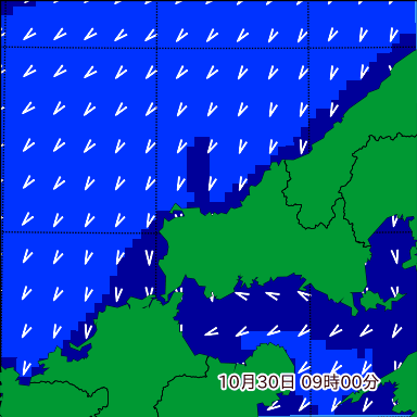 EiRj付近の波高を2日先まで分布図で確認できます。波高予測を広域で確認できるので、台風や低気圧による波高の推移や沖合のポイントの波高の参考になります。