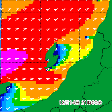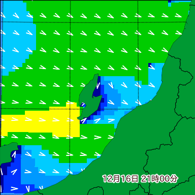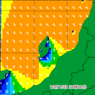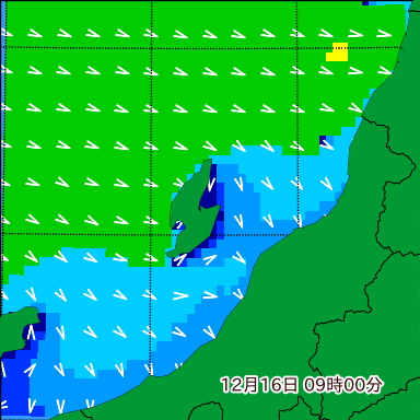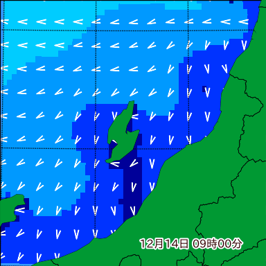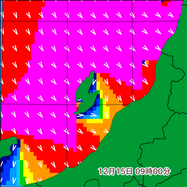 n付近の波高を2日先まで分布図で確認できます。波高予測を広域で確認できるので、台風や低気圧による波高の推移や沖合のポイントの波高の参考になります。