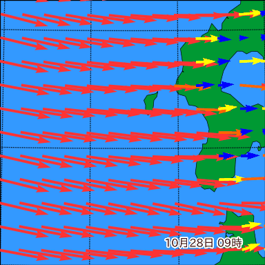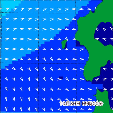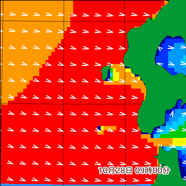 K付近の波高を2日先まで分布図で確認できます。波高予測を広域で確認できるので、台風や低気圧による波高の推移や沖合のポイントの波高の参考になります。