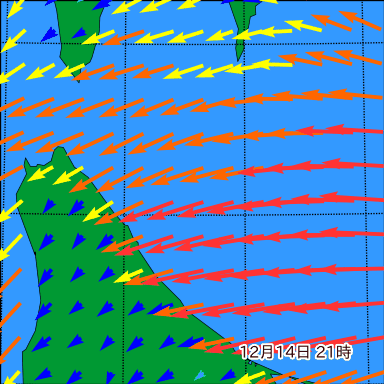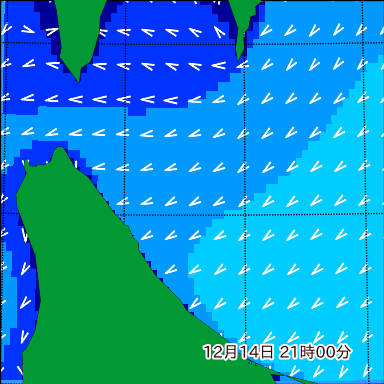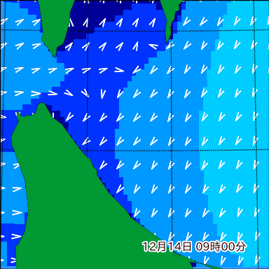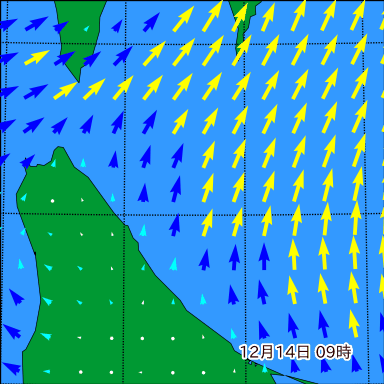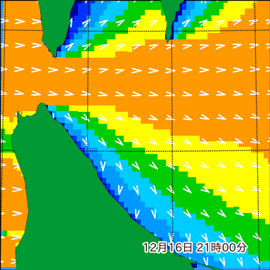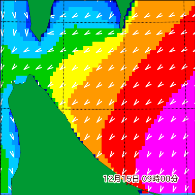 }K付近の波高を2日先まで分布図で確認できます。波高予測を広域で確認できるので、台風や低気圧による波高の推移や沖合のポイントの波高の参考になります。
