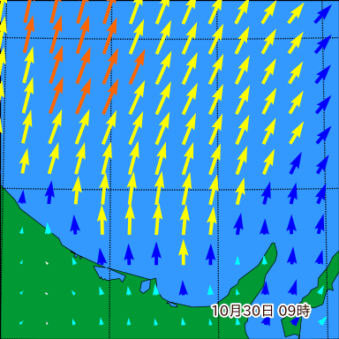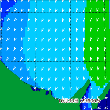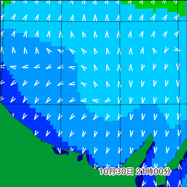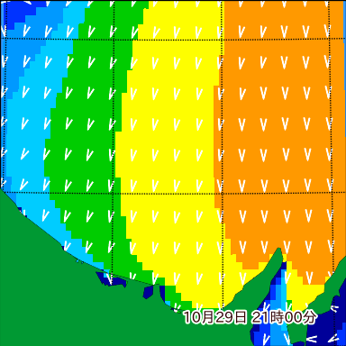ヤ付近の波高を2日先まで分布図で確認できます。波高予測を広域で確認できるので、台風や低気圧による波高の推移や沖合のポイントの波高の参考になります。