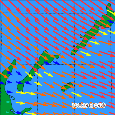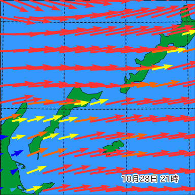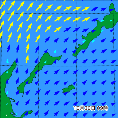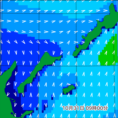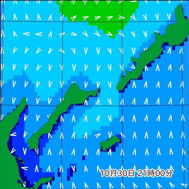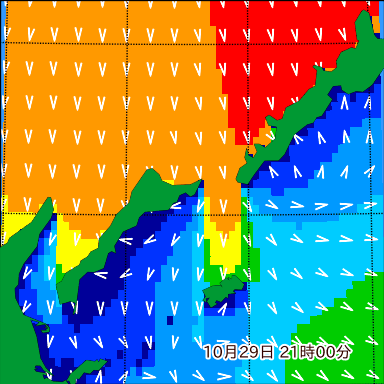 付近の波高を2日先まで分布図で確認できます。波高予測を広域で確認できるので、台風や低気圧による波高の推移や沖合のポイントの波高の参考になります。