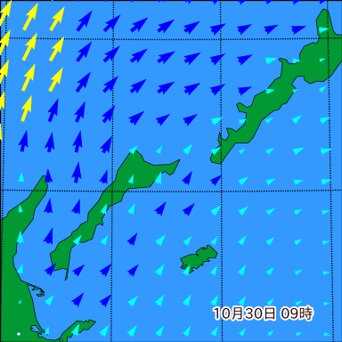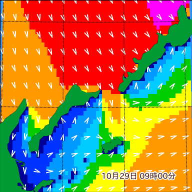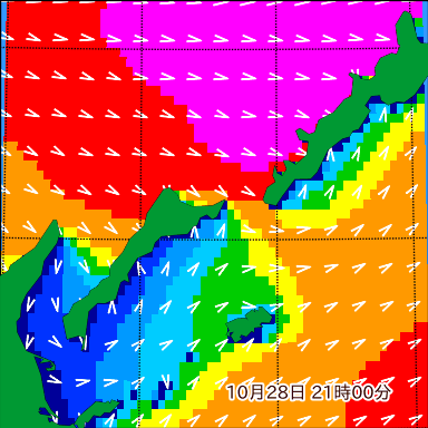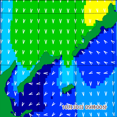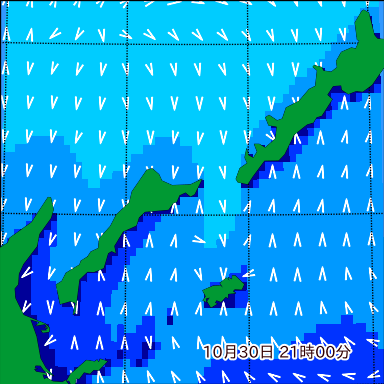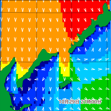 纉付近の波高を2日先まで分布図で確認できます。波高予測を広域で確認できるので、台風や低気圧による波高の推移や沖合のポイントの波高の参考になります。