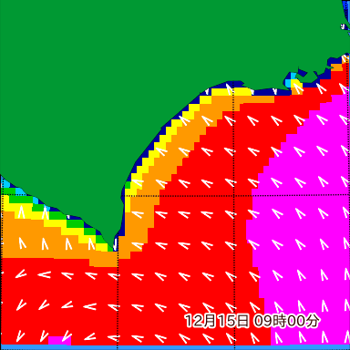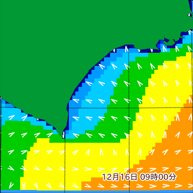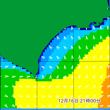 付近の波高を2日先まで分布図で確認できます。波高予測を広域で確認できるので、台風や低気圧による波高の推移や沖合のポイントの波高の参考になります。
