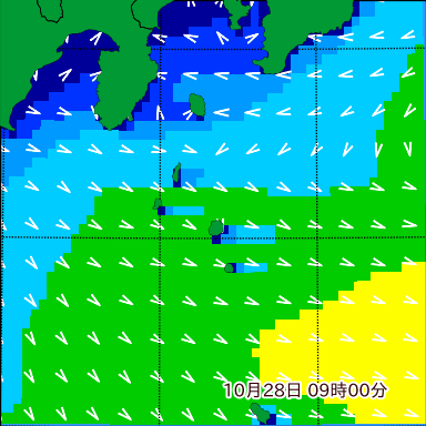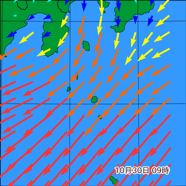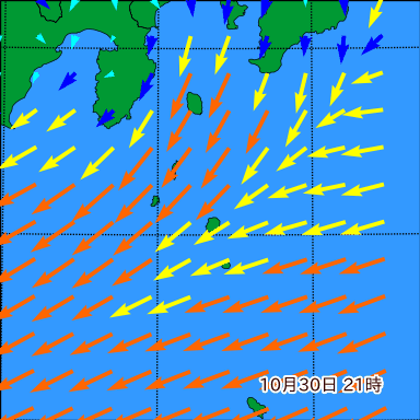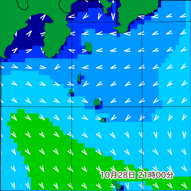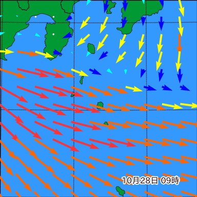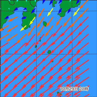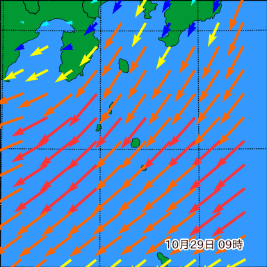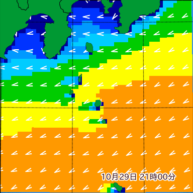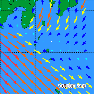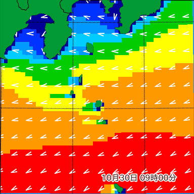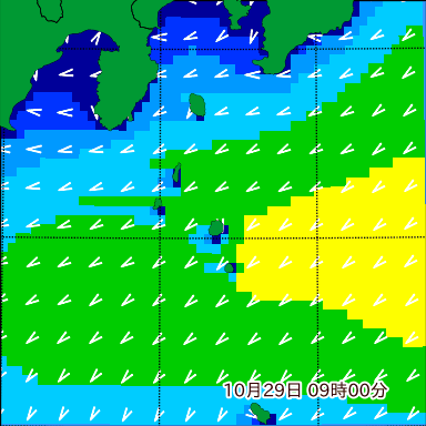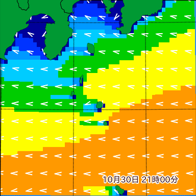 ノ付近の波高を2日先まで分布図で確認できます。波高予測を広域で確認できるので、台風や低気圧による波高の推移や沖合のポイントの波高の参考になります。